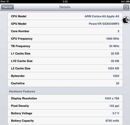 iPad mini 測試,規格為A5雙核1GHz處理器、GPU PowerVR SGX543MP2、512MB RAM、電池容量6750mAh,速度大致與iPad 2 差不多。