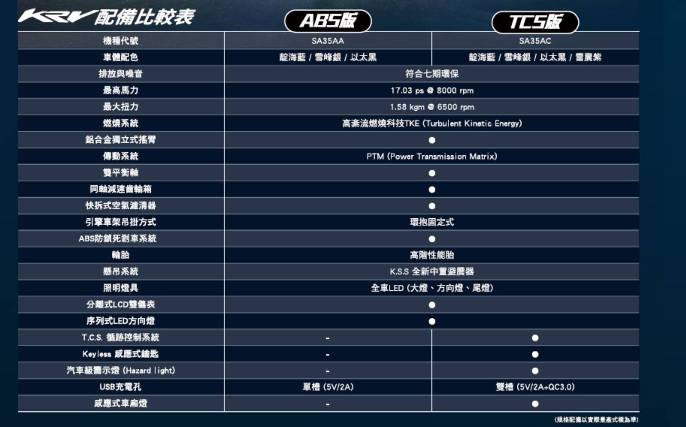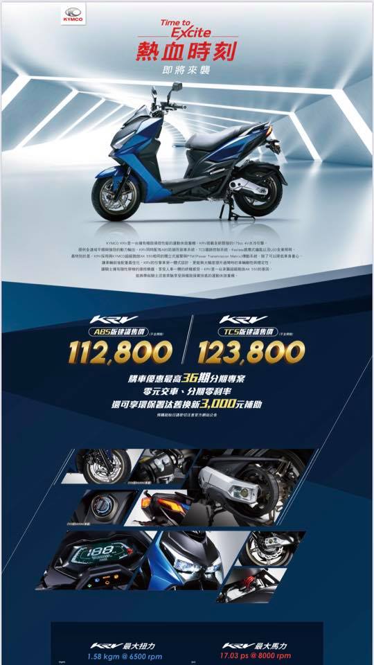 Kymco KRV 發表,全新 175cc 強制水冷單缸 SOHC 4V 引擎,最大馬力16.72ps (12.3kw)@7500rpm,前後雙碟ABS 防鎖死煞車,TCS 循跡防滑系統 + Keyless 晶片鑰匙,可選無 TCS 版本 + 傳統磁石防盜蓋鑰匙,售價ABS版本11萬2800、TCS版本12萬3800。